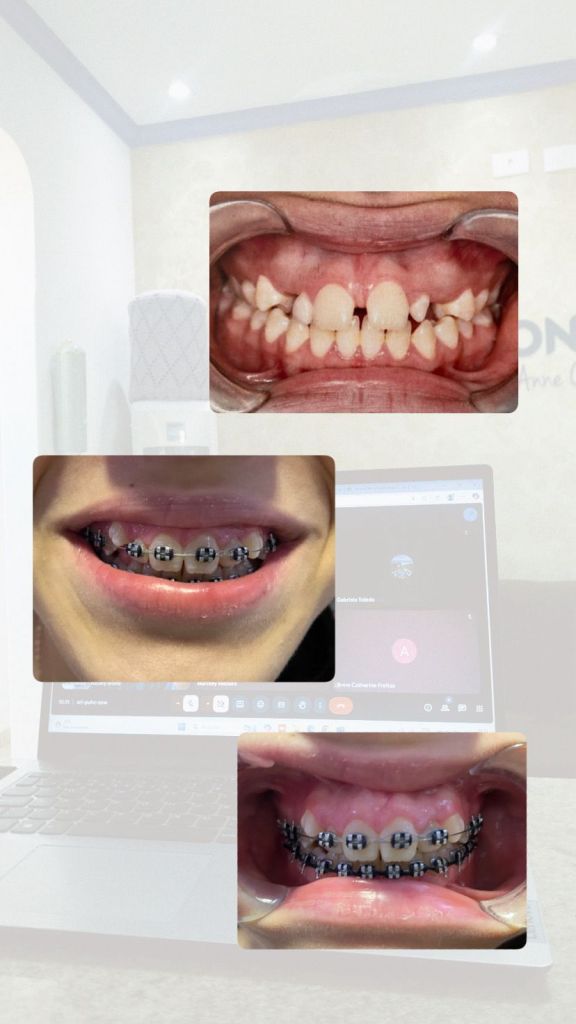 Imagens em close-up (primeiro plano) de dentes de crianças com aparelhos ortodônticos, mostrando vários alinhamentos dentários e tratamentos.